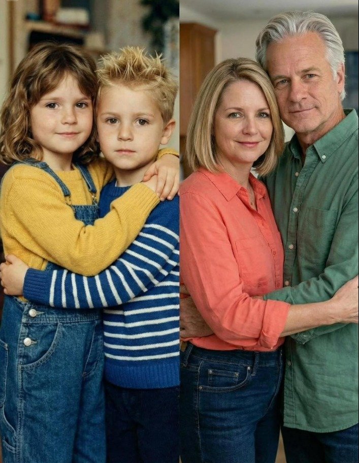 The image you shared looks like a “then-and-now” style composite — on the left, two children hugging, and on the right, a middle-aged couple in a similar pose. These kinds of images are often used to tell emotional or dramatic stories, especially online.